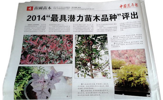 由《中國花卉報》社組織的第十二屆中國苗木交易會“2014年度最具發(fā)展?jié)摿γ缒酒贩N”評選結(jié)果近日揭曉,參展單位選送的紫色王子海棠、金陵黃楓等展品最終入選。