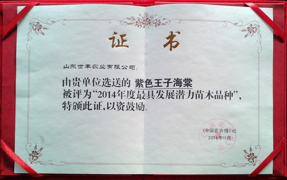獲評“2014年度最具發(fā)展?jié)摿γ缒酒贩N”的展品包括:山東世豐農(nóng)業(yè)有限公司的紫色王子海棠、江西德興市榮興苗木有限公司的福祿紫楓、南京朋合農(nóng)業(yè)開發(fā)有限公司的金陵黃楓以及河南遂平名品花木園林有限公司的紅粉世家石楠。