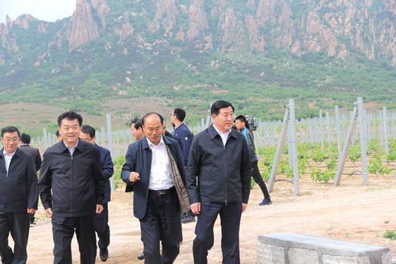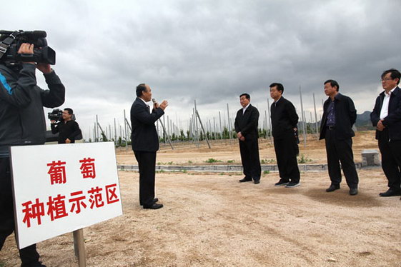 五蓮縣副縣長向市委書記一行介紹九五園區(qū)葡萄種植基地。