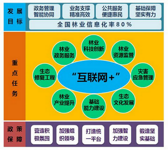 “十三五”時期林業(yè)信息化發(fā)展要全面融入林業(yè)工作全局,“互聯(lián)網(wǎng)+”林業(yè)建設(shè)將緊貼林業(yè)改革發(fā)展需求,通過8個領(lǐng)域、48項重點工程建設(shè),有力提升林業(yè)治理現(xiàn)代化水平,全面支撐引領(lǐng)“十三五”林業(yè)各項建設(shè)。