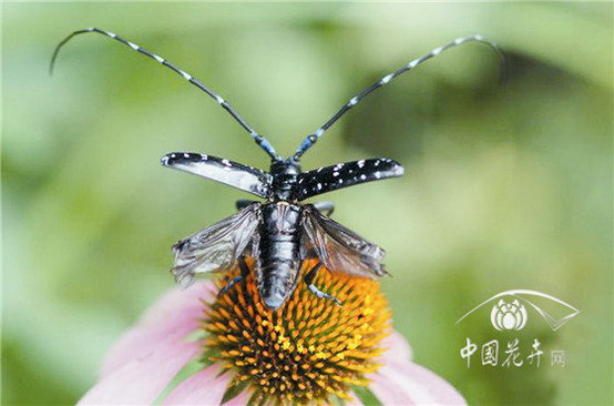 成蟲(chóng)身漆黑,扁平紫銅光。觸角比身長(zhǎng),十二節(jié)鞭狀。各有一刺突,前胸兩側(cè)旁。鞘翅上絨斑,白色不同樣。